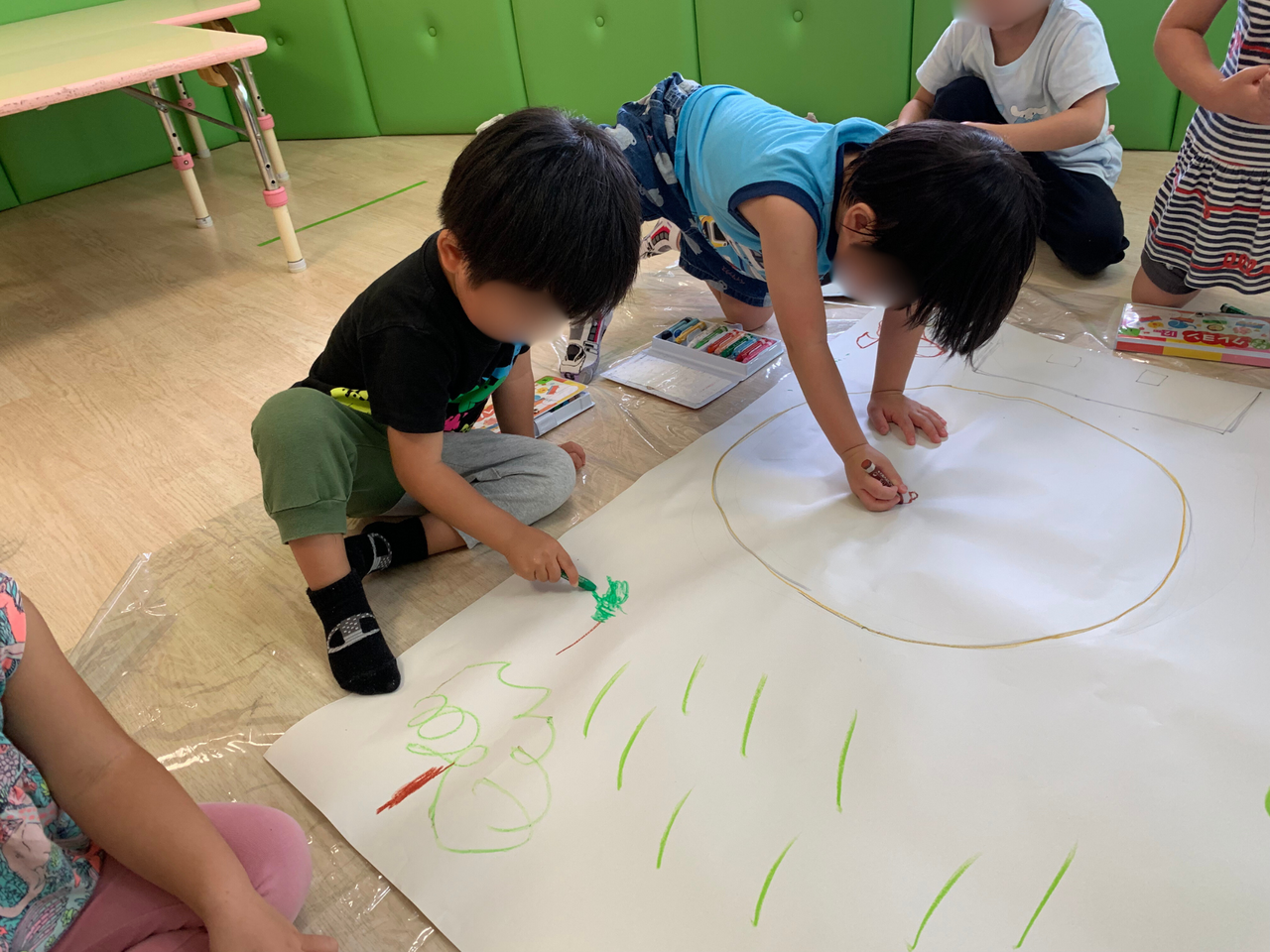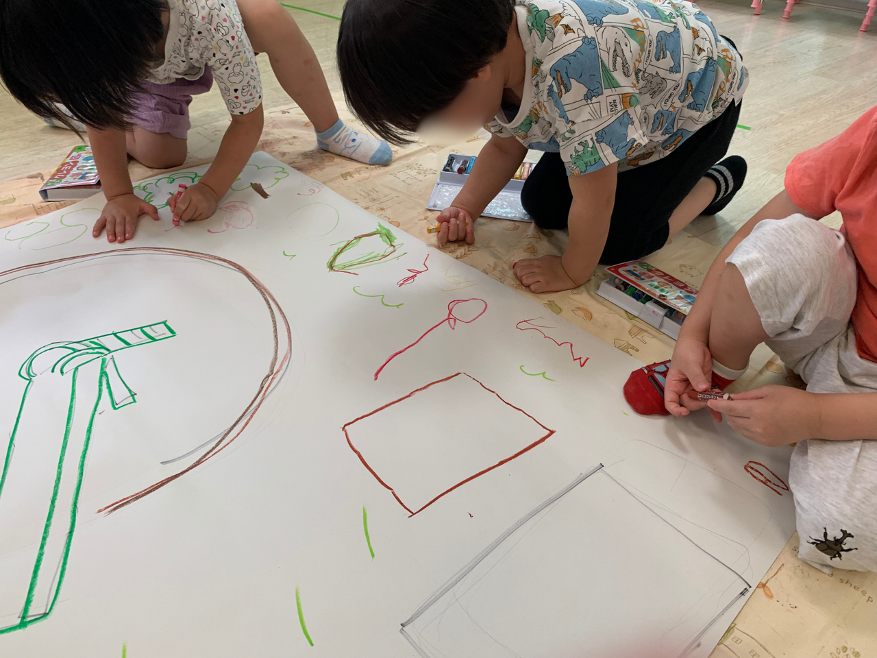 そこに、子どもたちはこれまでの散歩の記憶を思い出すように、クレヨンを手に取り描き始めます。