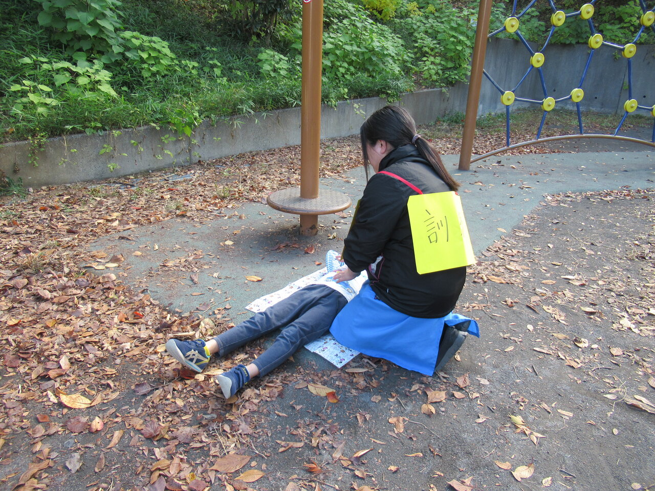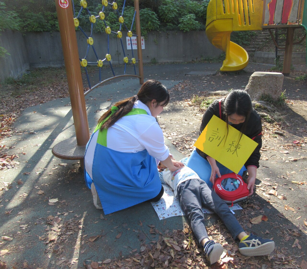 お散歩先の公園で、子どもが遊具から落ちてしまい、呼吸が止まっているという場面を想定して訓練を行いました。