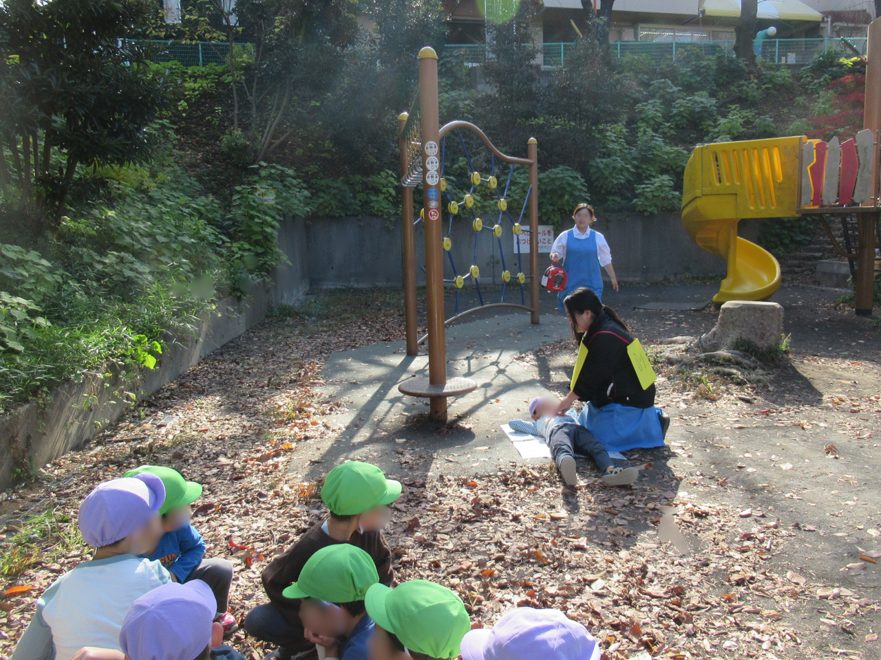 お散歩先でのもしもに備え、公園での遊具からの転落を想定した緊急対応訓練を行いました。